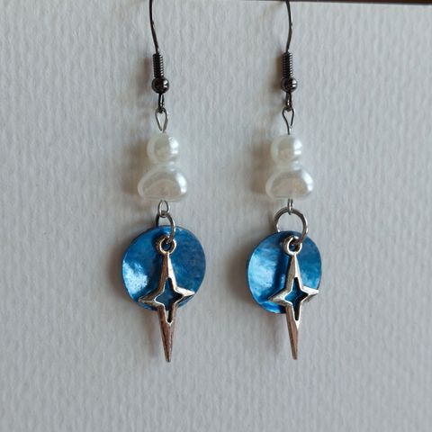 Uudet käsintehdyt korvakorut. Korvakoukku on kirurgin terästä (rst 316) ja muut materiaalit ovat simpukankuori ja korumetalli. Korvakorun pituus koukkuineen on 8 cm.