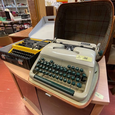 Kirjoituskone n. 45v. vanha toimiva kanto kotelolla, musta/punainen mustenauha kuivunut.