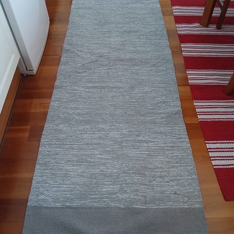 Valkoinen puuvillamatto, siniset raidat, kevyt matto käyttää
