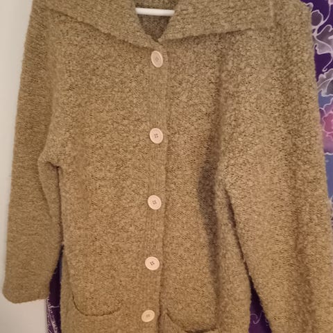 Hyväkuntoinen Proforma-merkkinen neuletakki. Tukevahko 100 % puuvillaneule. Kaunis kaulus, edessä ei nappeja tai muuta kiinnitystä. Koko M.