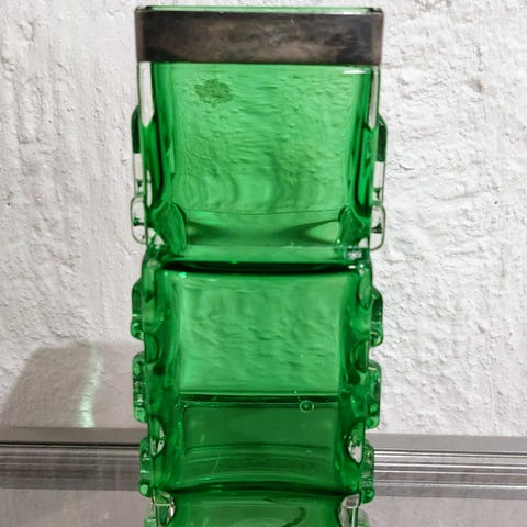 Pertti Santalahden suunnittelema Wärtsilän nimikkko maljakko. Valmistettu Nuutajärven lasi tehtaassa 1970- luvun alussa. Hopea panta.
