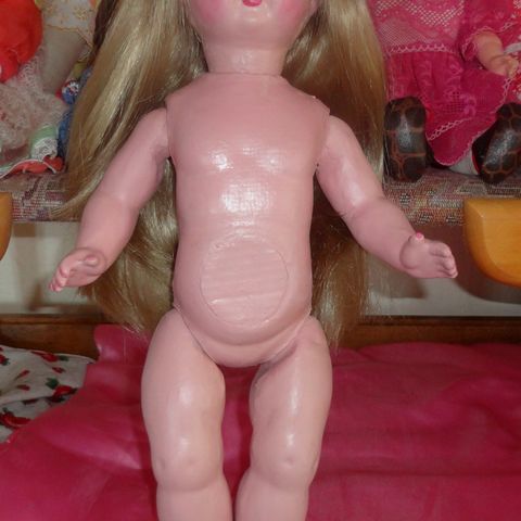 Värikäs pitkulaisista helmistä tehty ison nuken tai esim. vauvanuken kaulakoru. Yksi helmi on tainnut murtua pois, muuten hyväkuntoinen.