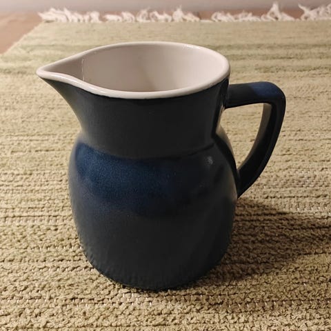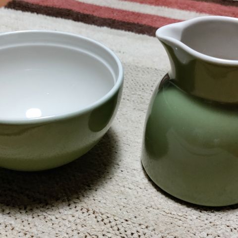 Kermansavi, Oliivi -kermakko+sokerikko, vihreä, kermakon korkeus 8.5 cm ja pohjan halkaisija 7,8 cm suuaukon 5,6 cm, sokerikon korkeus 6 cm ja halkaisija 10 cm, uudenveroiset, yhteishinta, toimituskulut lisätään, ei toridiilinä.
