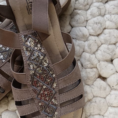 Ruskeat nahkasaalit koko 38. Kotona sisätiloissa käytetyt. Koristekiviä irronnut ja käytönjälkeä löytyy. Mukavan pehmeät jalassa. Anatomic anti-shock. Tarrasäätö.