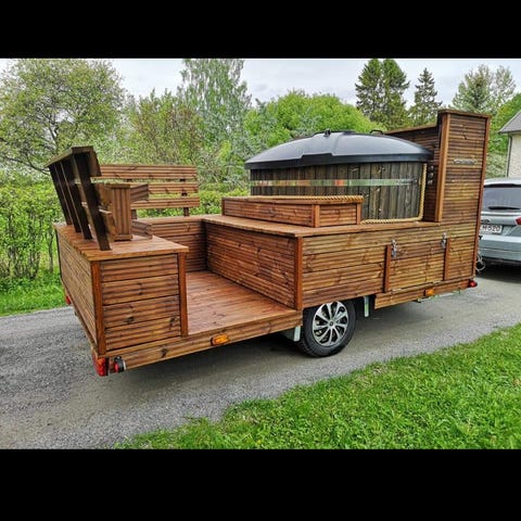 Vuokralle tarjolla hyvin varusteltu 8hengen paljukärry jossa valot ja poreet.