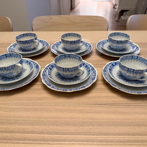 Yhdessä setissä kuppi+aluslautanen +asettilautanen. Näitä löytyy enemmänkin.