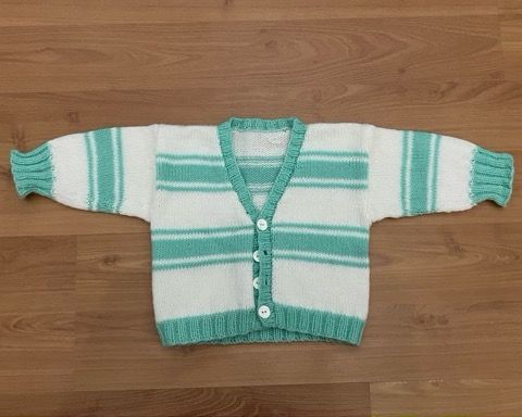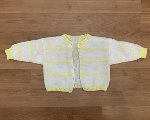 Tyttöjen neuletakki. Olalta helmaan 47 cm. Hihan pituus 30 cm. Puuvilla neule.