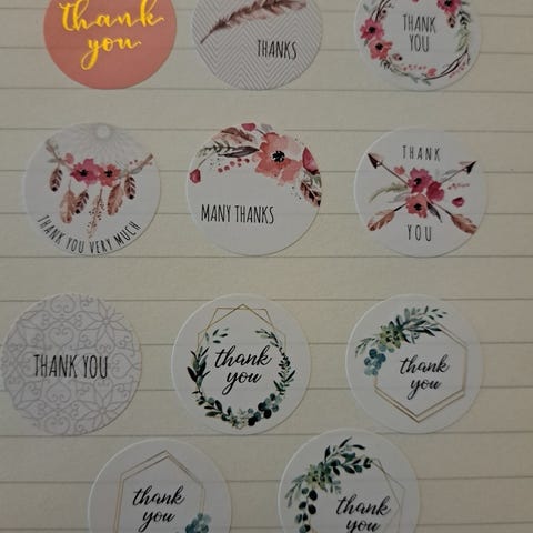 Thank you tekstillisiä tarroja . Tarroja on 1 erilaista. Halkaisija noin 2.5cm.