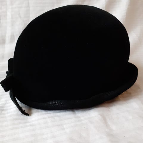 Musta huopavuorinen hattu, jossa todella kaunis pieni viistomainen lippa. Hatun päällinen pehmeää nukkapintaista kangasta. Hatussa myös kaunis mustista helmistä tehty koriste, jossa roikkuvat osuudet. Tosi tyylikäs ja priimakuntoinen hattu. Oikeasti vanha. Hinta 35e. Koko noin 55 cm.