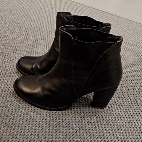 Mustat ja siistit jalkaan vedettävät saappaat. Kiristys niittihihnalla.