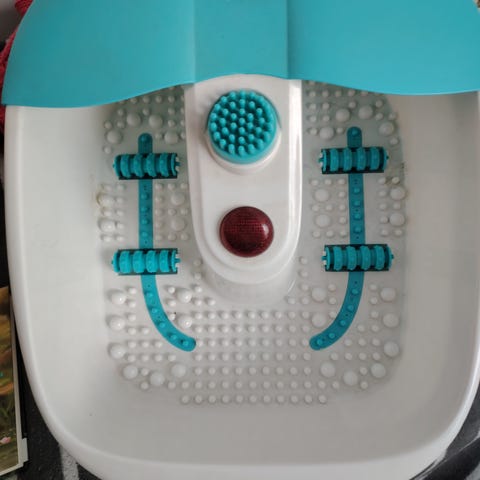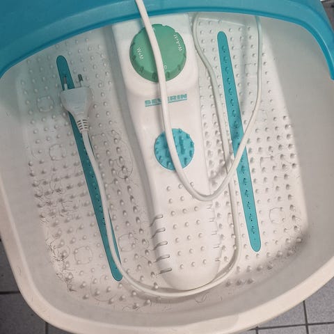 Hyväkuntoinen ja siisti, toimiva jalkakylpylaite. Pohjaan saa kiinnitettyä hierovat rullat, valittavissa kylpy poreilla tai ilman. Sisältää pedikyyrivälineet.