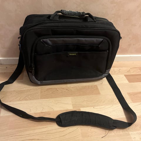 Musta Laukku, koko 48.5x35 cm, säädettävä ja irrotettava olkahihna, kantokahva, suulla vetoketju, sisäpuolella iso tarratasku, tarranauhat toisella puolella, ehjä.