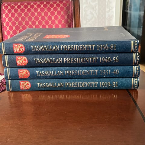 Weiling+Göös kirjasarja tasavallan presidentit. Painettu 1992-1994. Valkoisten suojapaperien kanssa säilytetty.