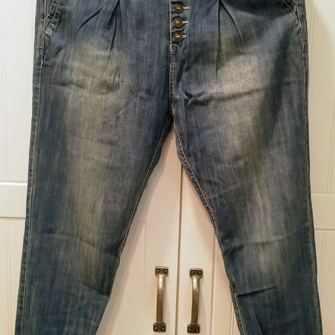 Farkut, kapea malli. Vetoketjut lahkeissa. Koko 28/30. Hinta 7eur + postimaksu.