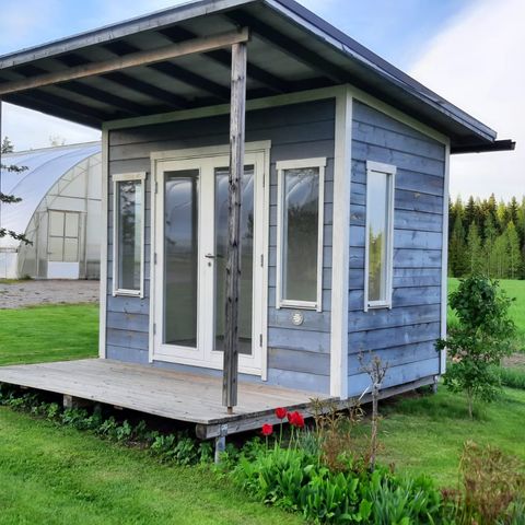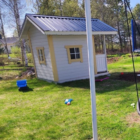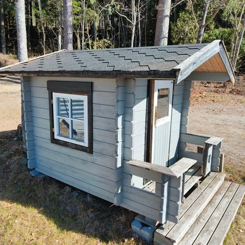 Myydään.Hirsilovilla rakennettu leikkimökki tarvikkeineen.