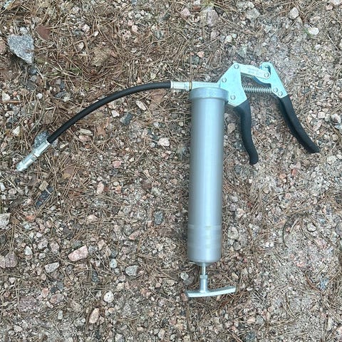 Kannessa kytkin jolla saa ohjattua sylinterin toimintaa. Kyljessä paineilmaliitin. Tölkit tippuu säiliöön.