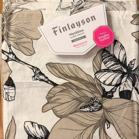 Finlayson pöytäliina koossa 140x230cm. Pidetty yhdet juhlat ja pesty, joten kunto on moitteeton. 😊