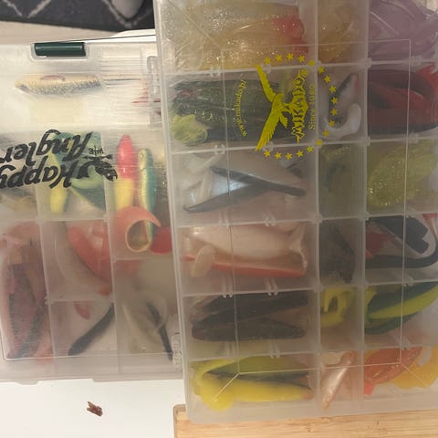 Kuvanmukainen satsi erilaisia jigejä rasia kuuluu mukaan nouto/postitus+pm