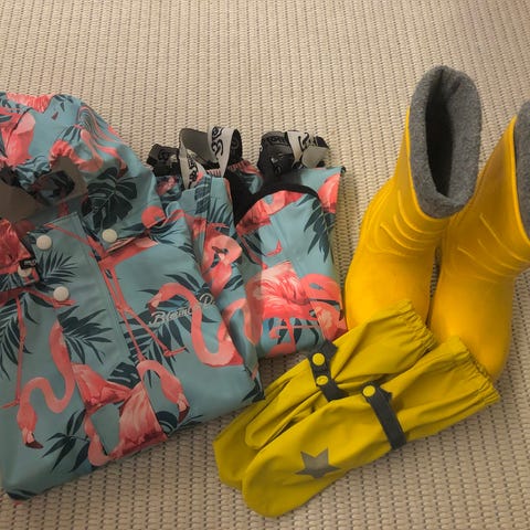 1. HELLO KITTY- Punainen sadetakki + LASSI- kura/ sade housut
