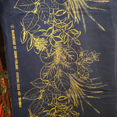 Kuvan punainen painettu pöytäliina. Pituus n.240, leveys n140. Käytetty, jotain haalistumaa taitteessa, ei tahroja. Tästä upea liina jouluksi. Tai muuten tähän harmauteen. Mmm.