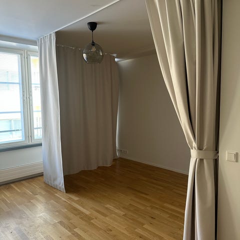 Myynnissä eripituisia käyttämättömiä puolipyöreitä verhokiskoja. Kiskot ovat yksiuraisia leveydeltään ja korkeudeltaan noin 16mm. Väriltään puhtaan valkoisia.