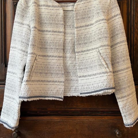 Käytetty valkoinen jakku Vila kokoa S. 3/4 pituiset hihat, hihojen sisäreunassa rypytys. Yksi povitasku.