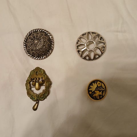 Kolme erilaista rintaneulaa. Kaikki yhteensä 1 euro tai erikseen 0,50 euroa.