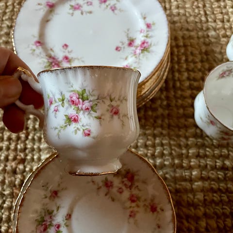 Kakkutarjotin ja erikseen 10 ruusukuviollista kahvikuppia