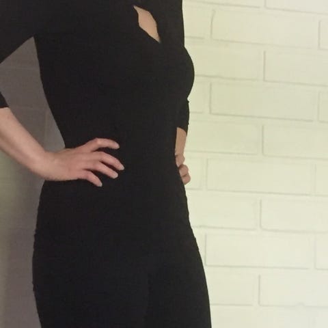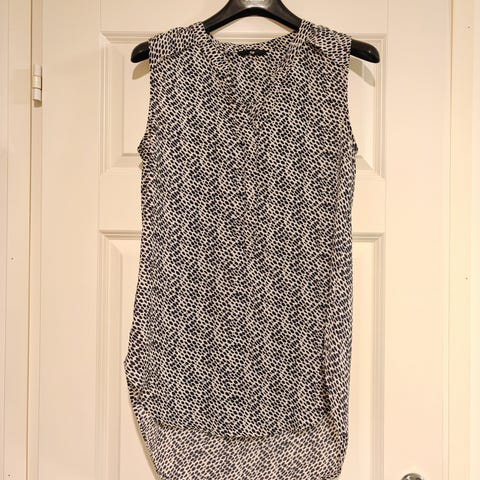Koko S / 36. Mitat: kainalo-helma 49cm, kainalo-kainalo 39cm, hihan pituus kainalosta 47cm. Vartalonmyötäinen, materiaali joustaa hyvin. 80% viskoosia, 20% elastaania.