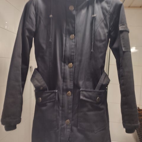 Emp:ltä tilattu violetti collegetakki /parka, koko S. Menee n. koolle 36/38. Hupussa kiristysnyörit, takana helmassa myös kiristysnyörit, helmasta vähän pidempi. Kaksisuuntainen vetoketju, vetoketjut myös hihoissa. Edessä taskut. Kivan mallinen, muutaman kerran pidetty. Nouto /+postit 5e.