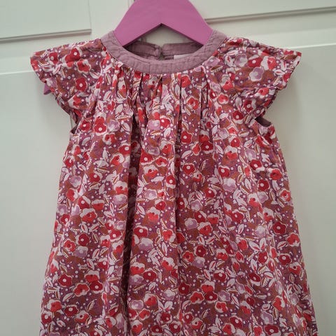 Ylhäällä laskoksia ja kiiltävät napit, helma reikäkirjailua.