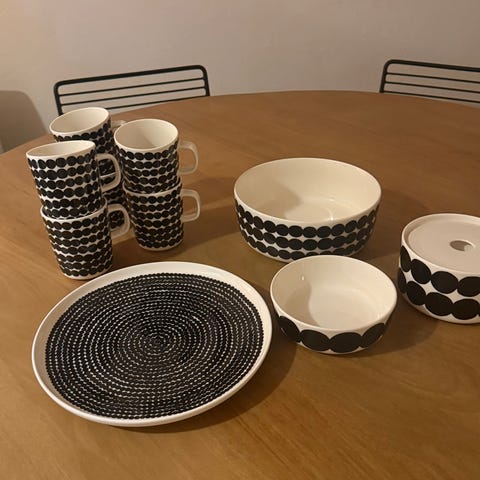 Marimekko kulta harmaa valkoinen mukit ja lautaset