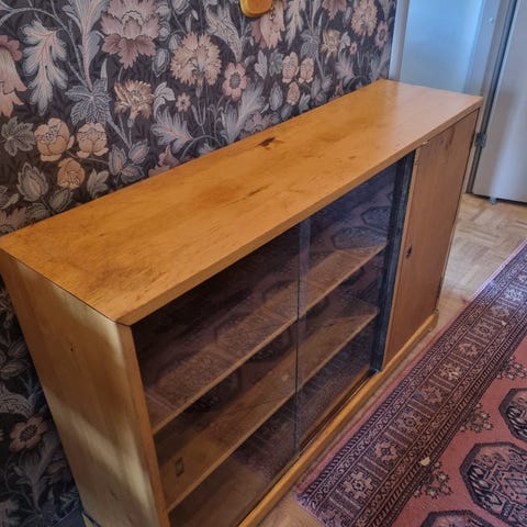 Vanha Siro kirjakaappi liukulasiovilla, lasihyllyt säädettävissä. Lev/syv 82/25 cm, korkeus 58cm.