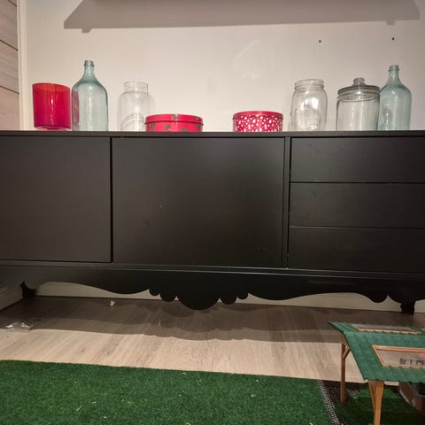 Musta Trollsta senkki. Käytön jälkiä erityisesti kannessa ja pari selkeämpää kolhua lipaston keskimmäisen oven kehikon alareunassa, yleisilme kuitenkin edelleen siisti ja vetolaatikot avautuvat sulavasti. Kaappien ovien kiinnikkeitä täytyy säätää (ruuvimeisselillä kiristää/löystää), jotta kaappien ovet avautuvat helpommin. Ei muita havaittuja vikoja.