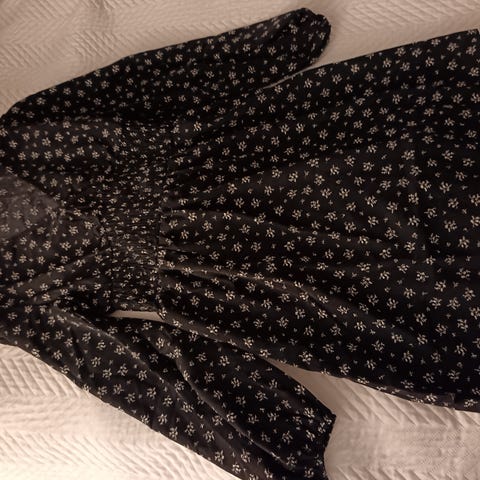 Mustavalkoinen mekko, Onlyn. Selässä ristikko. Kauluksessa pieni tahra, joka ei ole lähtenyt pesussa.