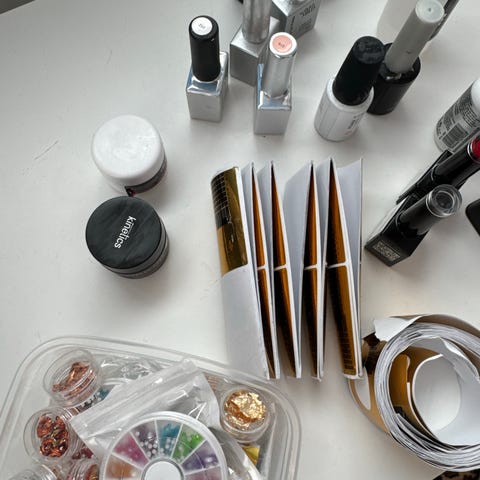 Turkoosi kosmetiikkapakkaus, jossa on erilaisia ihonhoitovälineitä kuten pinsetit, sakset ja erilaiset lastat. Pakkaus on valmistettu tekonahasta tai vastaavasta materiaalista ja suljetaan vetoketjulla. Välineet sopivat esimerkiksi kynsien ja ihonhoitoon.