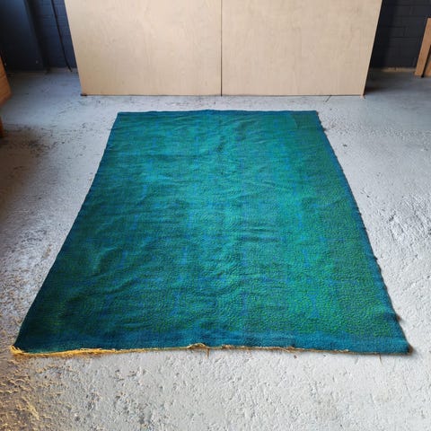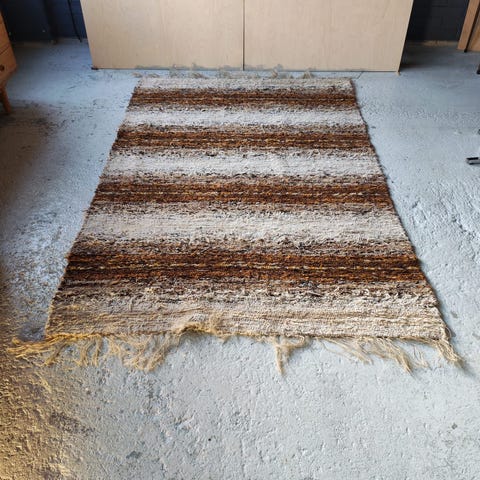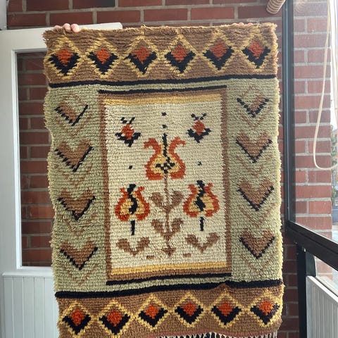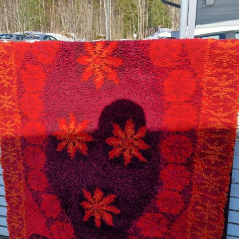 Vispipuuronpunainen käsin solmittu ryijymatto, 160 x 97 cm. Matto on ollut vintillä ja siinä on vintin hajua. Hajun saa pois tuulettamalla tai käyttämällä jotain mattopesujauhetta. Oletettavasti villaa.