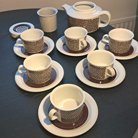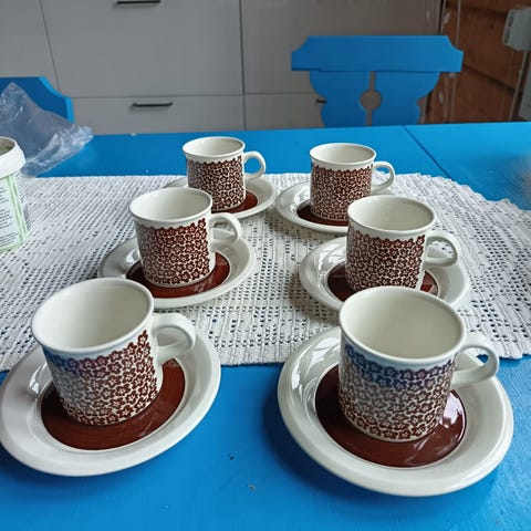 Myydään uudenveroinen, ihana, ruskeakukkainen Arabia Faenza kahviastiasto 6:lle. Design Inkeri Leivo. Retro sarja 1970-luvulta. 6kpl kahvikuppeja ja 6kpl aluslautasta. Pohjaleima Arabia Wärtsilä Faenza, kestää konepesun. Savuttomasta kodista. Postikulut 11euroa. Yhdistelen postikuluja. En käytä ToriDiiliä.
