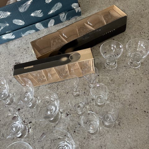 Hyväkuntoise ja ehjät lasit kork.10cm. ja halk.8,5cm.Yht.6lasia.Hinta lasille /18euroa.Ostajalle pk. tai noutoa Ruholahdesta.
