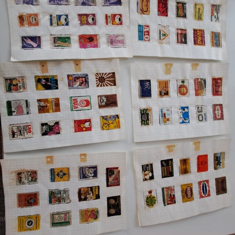 Erittäin vanhoja tulitikkuaskien etikettejä, vihkossa 94 sivua tulitikkuaskien etikettejä yhteensä noin 207 kpl. Useilla sivuilla monta etikettiä. Osa isompia, osa pienempiä. Liimattu vai yhdelle puolelle paperia. Erittäin hyvin säilyneet. Paljon vanhoja Made in Sweden etikettejä. Myydään myös erikseen.