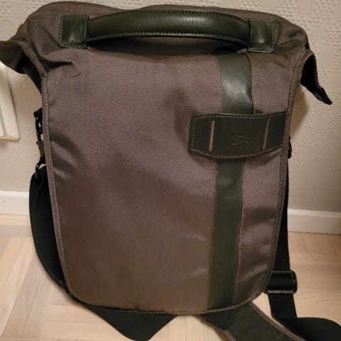 Lowepro kameralaukku. Korkeus 27,5 cm ja leveys 10,5-15,5 cm