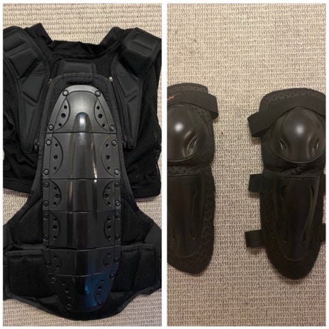 Hyväkuntoinen selkäpanssari, ehjä, vetoketju toimii ja pitää hyvin!