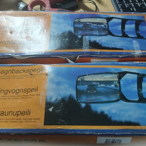 Asuntovaunun vetopeilit lyhyemmällä pituudella hinta alkain 19 euroo /pari , (Nuo pitkävartiset peilit on myyty), autonojauspyörän lukko 5 euroo, Soittele ,