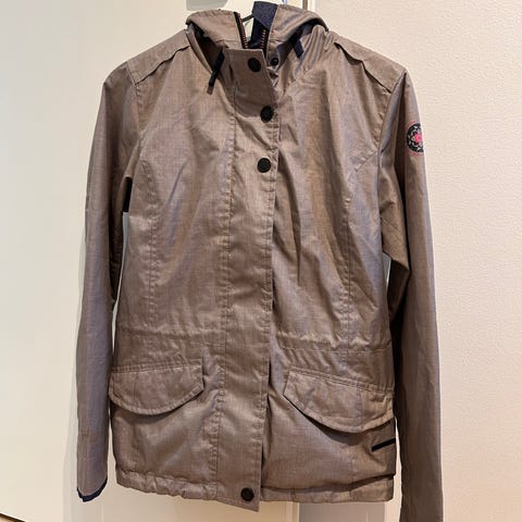 Myydään vähänkäytetty, tummansininen vedenpitävä Loft tuulitakki, koko 38. Selässä kaunis rypytys, huppu.