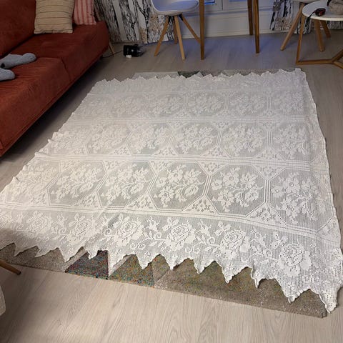 Käyttämätön kalastajalangasta käsin virkattu sängynpeitto / päiväpeitto parisänkyyn.