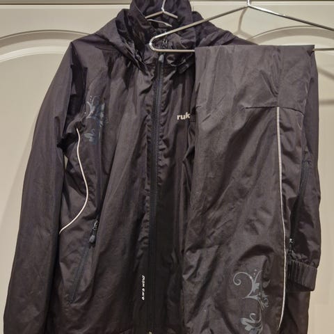 Naisten hiihtopuku, koko 40. Takin helma kiristettävissä ja kaksi taskua. Housujen lahkeensuussa kuminauha ja vetoketju, lahkeessa takana kiristysmahdollisuus pohkeen yläpuolella, vyötärönauha vyölenkeillä ja kaksi taskua.