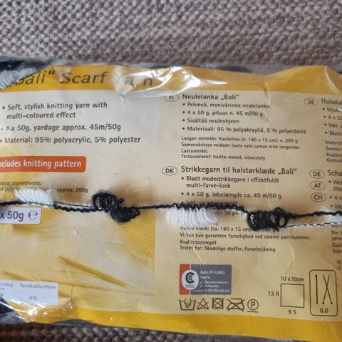 Pakkauksessa pehmeää verkkolankaa huivia varten. Sisältää ohjeen huivin valmistukseen.