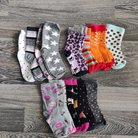 Nukkaa on pinnassa, mutta ovat tarkastamani mukaan ehjiä ja tahrattomia. Nimikoimattomat. Hajusteeton pesu. Raidallisten sukkien suun kuminauha hieman väsähtänyt.