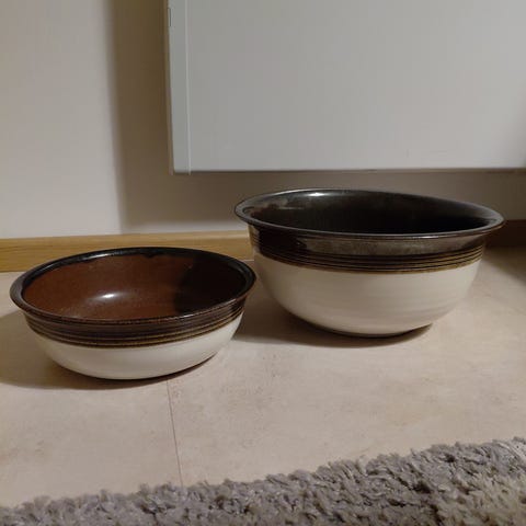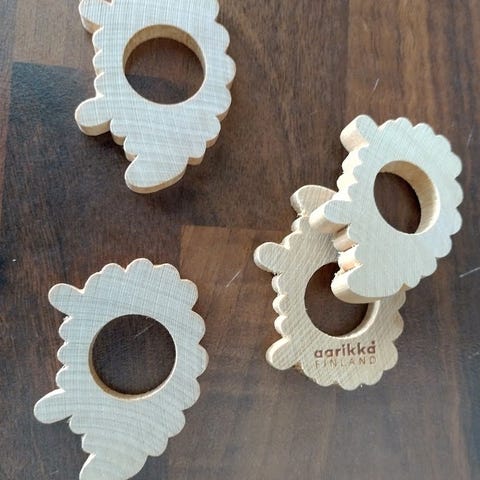 Seitsemän serviettirengasta. Jonkin verran käytön jälkiä, mutta edelleen ihan edustavat. Yhdessä renkaassa on pieni halkeama, joka on huomioitu hinnassa.