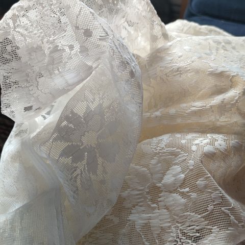 Käyttämättä jäänyt valkoinen Romance pitsikangas Eurokankaasta ostettu.